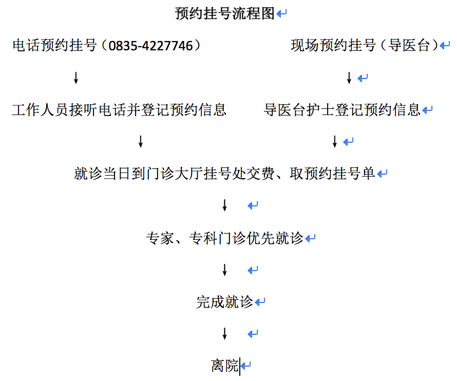 (2)电话预约: 0835-4227746。现场及电话预约服务时间:现场预约:上午8:30至12:00,14:30至16:00。电话预约:上午8:30至12:00,下午14:30至17:00。由导医台负责,接待登记。