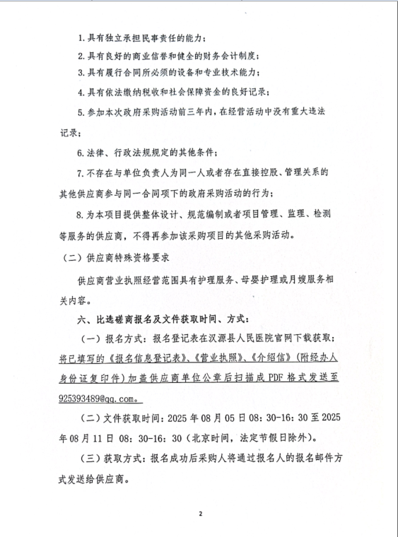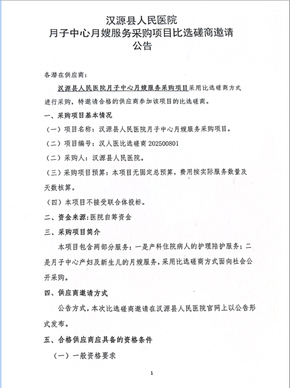 【招标采购】汉源县人民医院月子中心月嫂服务采购项目比选磋商邀请公告1